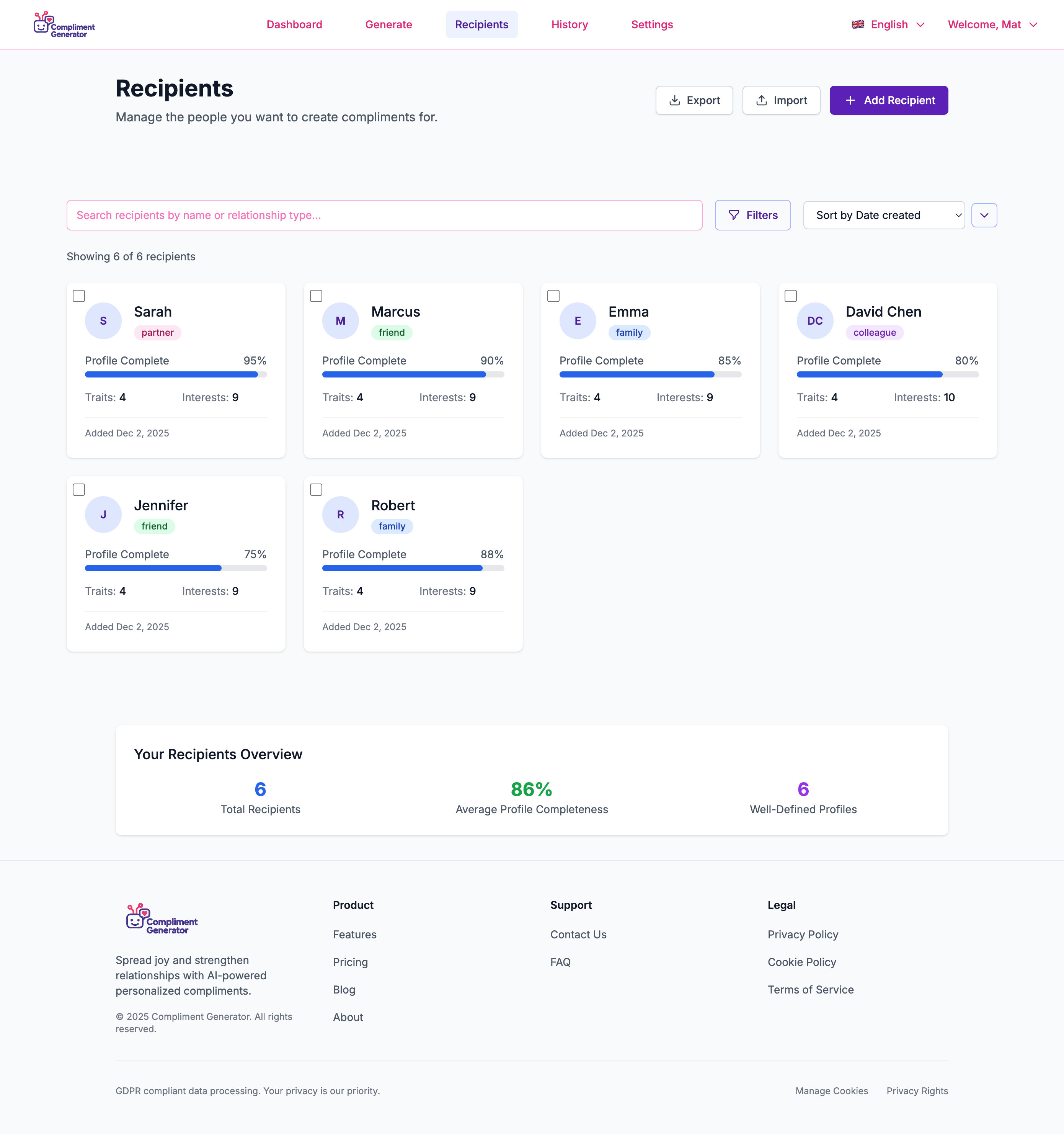 Store personality traits, interests, hobbies, and relationship context. The more details you add, the more personalized and meaningful your compliments become.